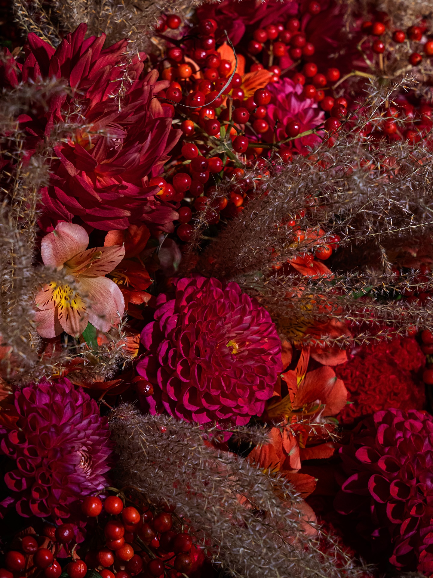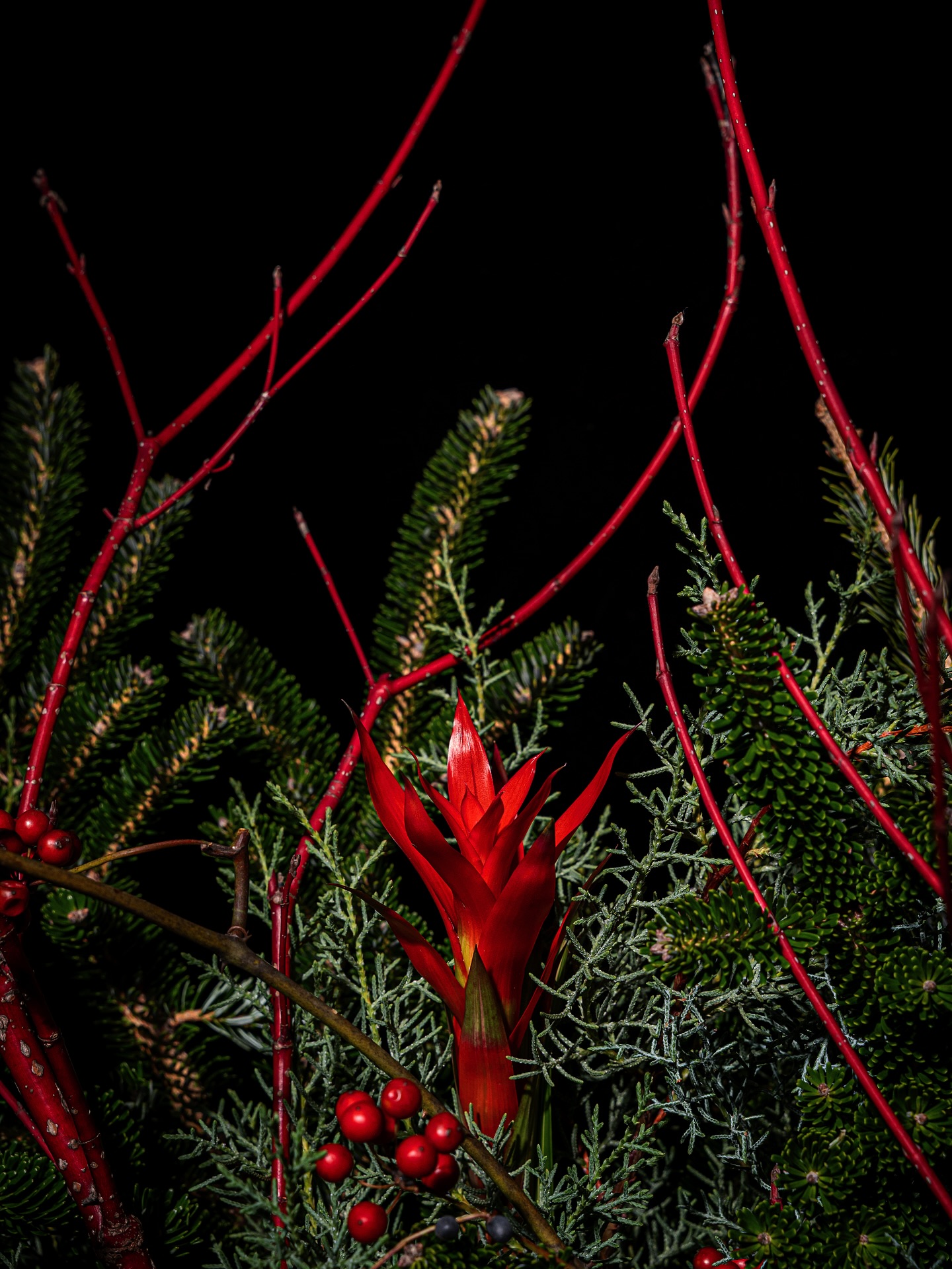I wanted to pour my soul so that it would overflow; no, burst out and erupt from within the darkness. This is the season when new life springs out with greenery.What I have in my hands is a maple leaf colored in crimson, appearing ahead of the seasons.The king of fruits Ananas (pineapple), which depicts the eruption from the hollow space, seems to have also taken on a vibrant scarlet color.